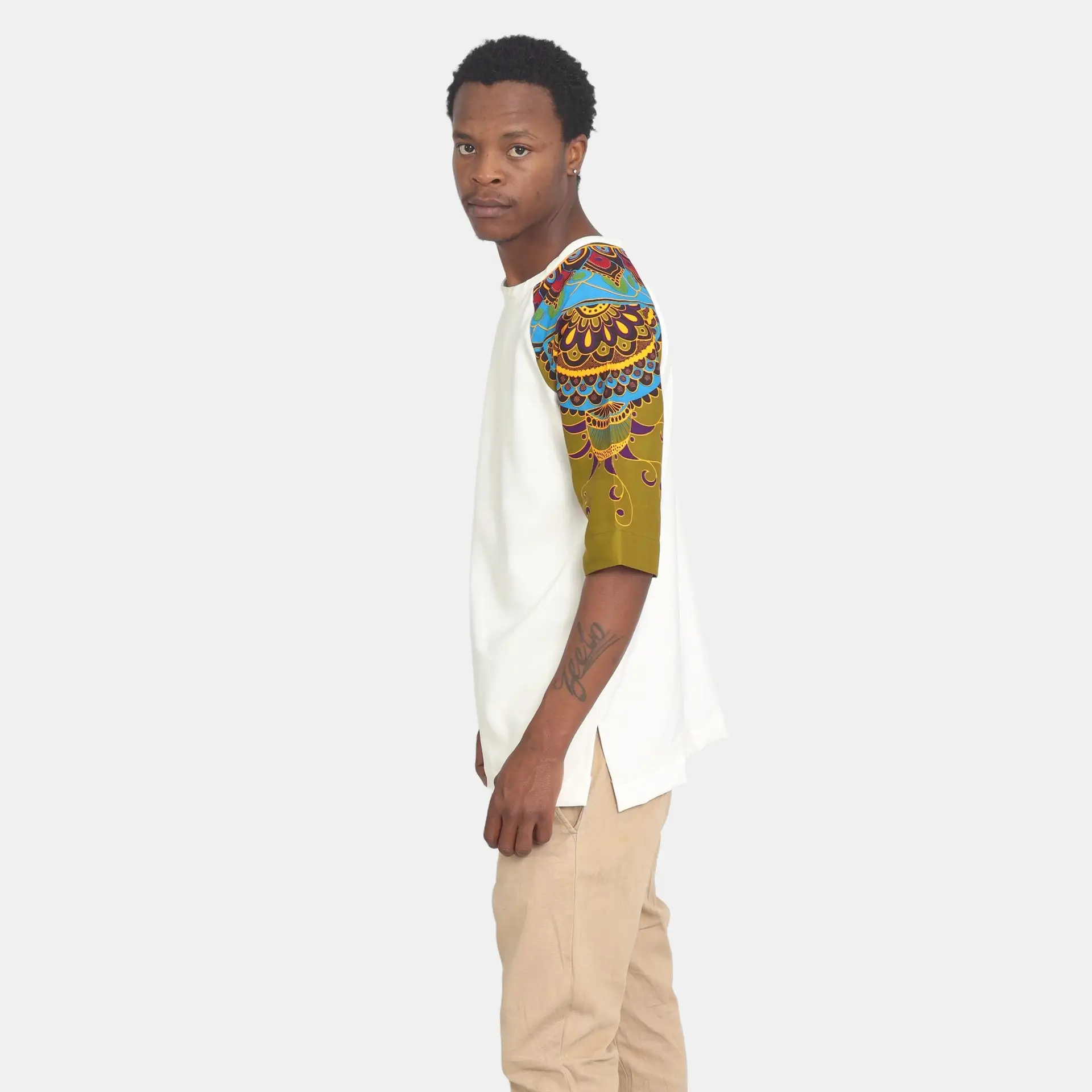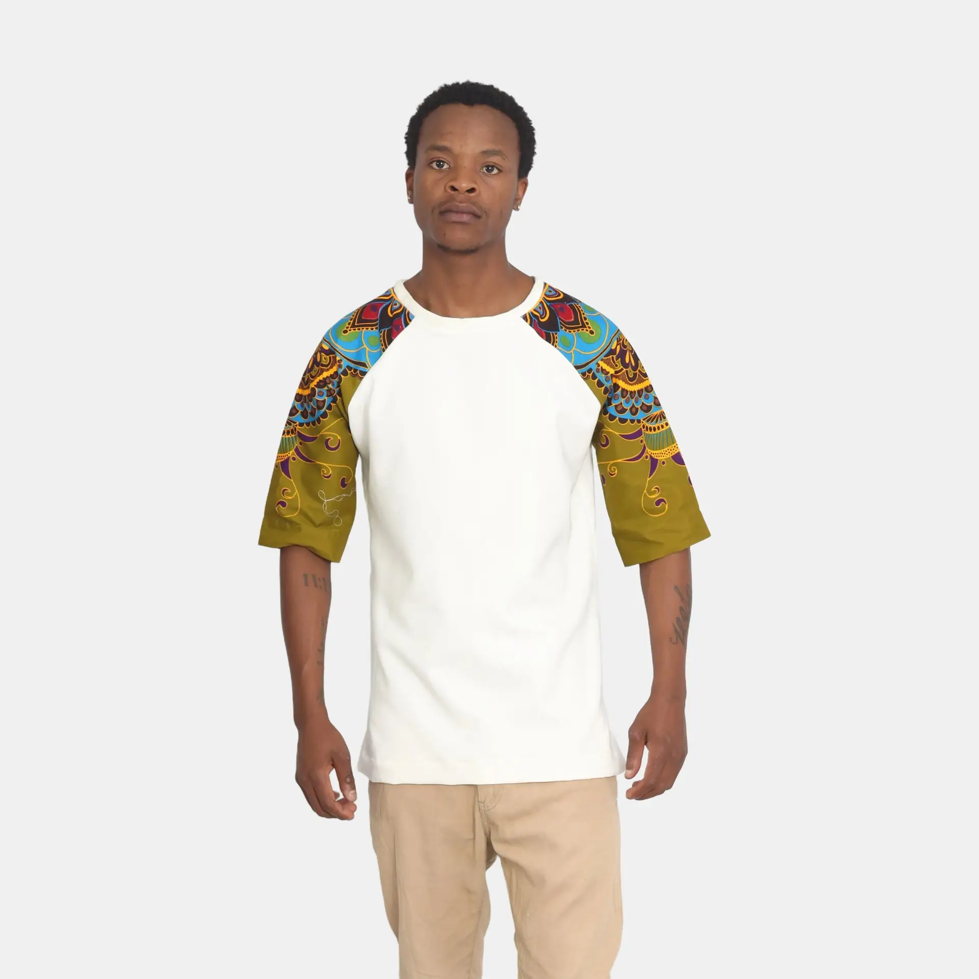 Enhance your casual wardrobe with our African Print Raglan T-Shirt in a sophisticated cream colour. This stylish and comfortable t-shirt merges contemporary design with traditional African patterns, offering a unique and eye-catching look. Perfect for those who appreciate cultural diversity and modern fashion, this t-shirt is ideal for any casual occasion, from everyday wear to social gatherings.